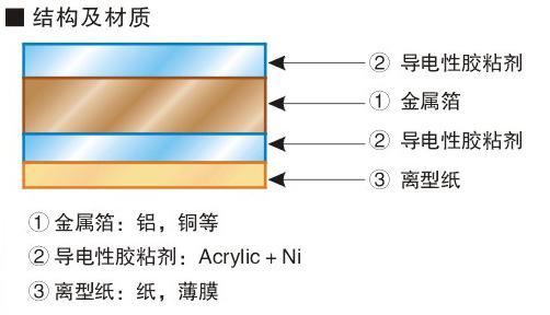 以金屬箔為主要基帶,涂上一層獨(dú)特的導(dǎo)電壓敏丙烯酸膠粘劑制成膠帶 ,提供離型紙,易于模切和使用。銅箔膠帶和鋁箔為基帶的膠帶使用最為廣泛,其中又分為單面與雙面膠帶。